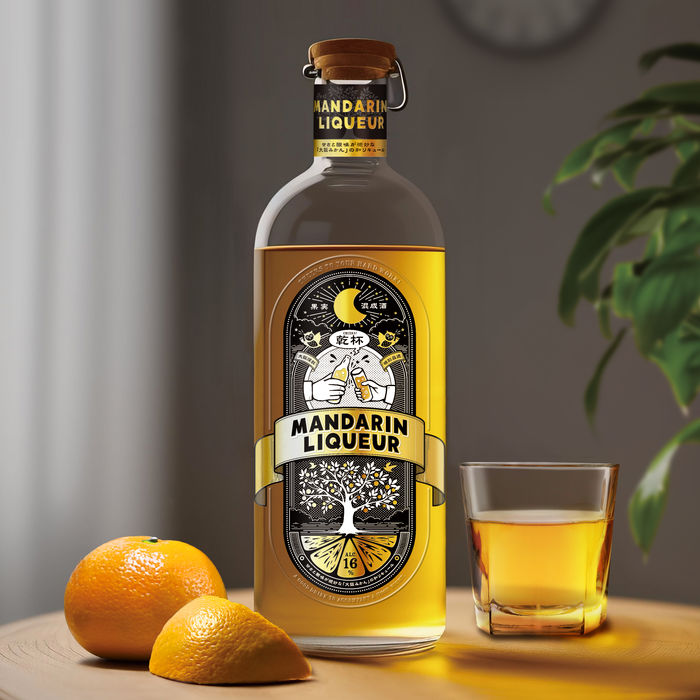 「大阪みかん」を使用したオレンジリキュールのラベル用イラストです。オレンジのシズル感とお酒を酌み交わす楽しい夜のイメージを表現しました。This is an illustration for an orange liqueur label using "Osaka Mikan". The illustration expresses the sizzle of the orange and the image of a fun night of drinking.